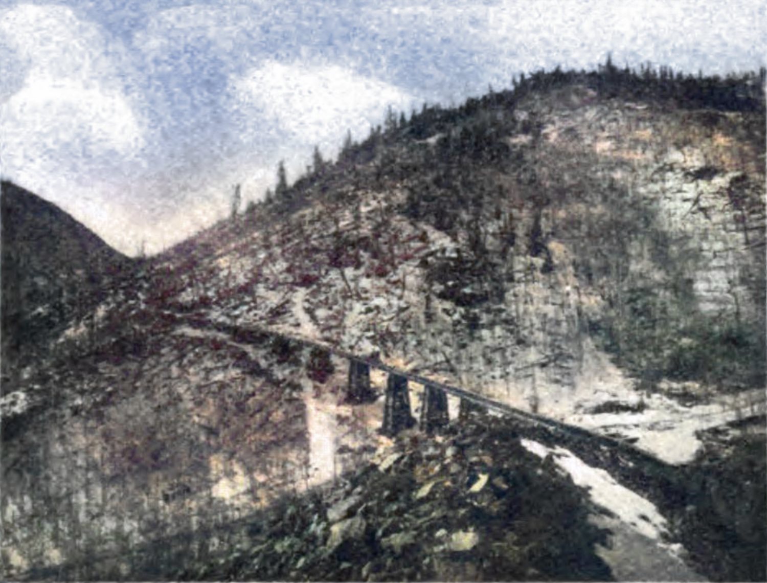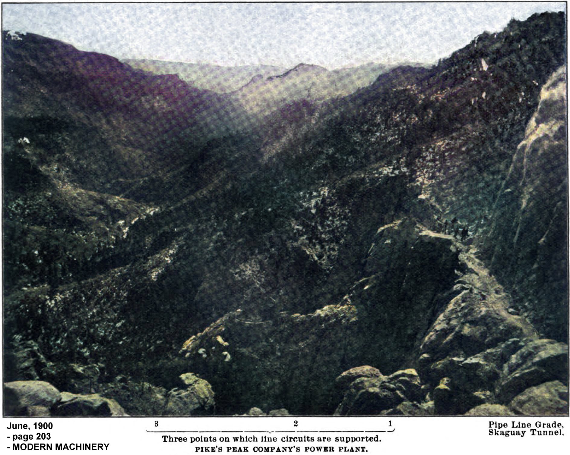 At one point it passes through an inclined tunnel 260 feet in length, just above which is a bridge 70 feet in height, and at various points there are extremely deep open cuts. From the south end of the Skaguay Tunnel the pipe line is entrenched in the grade on which is constructed a narrow gauge railway leading from the tunnel to the power house, and operated on practically a 38% grade.