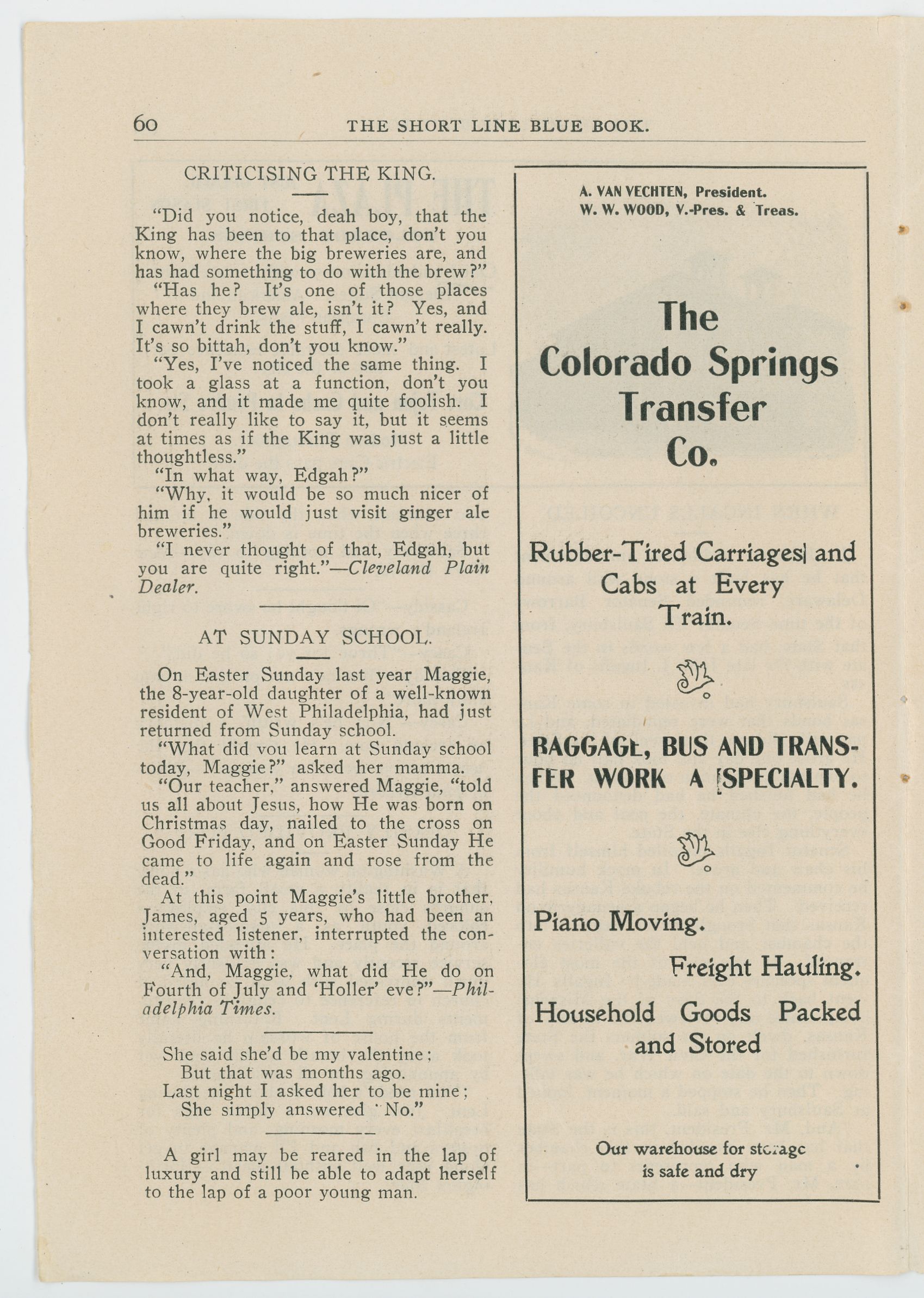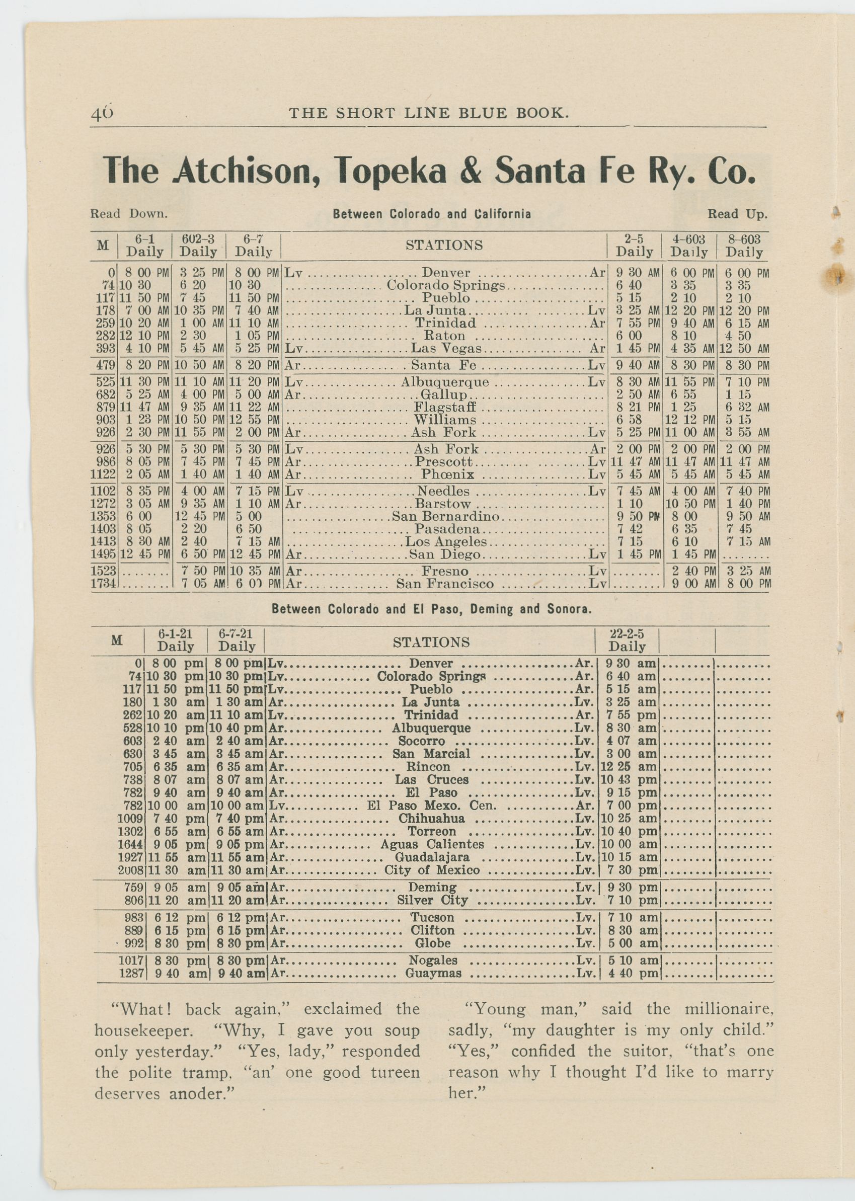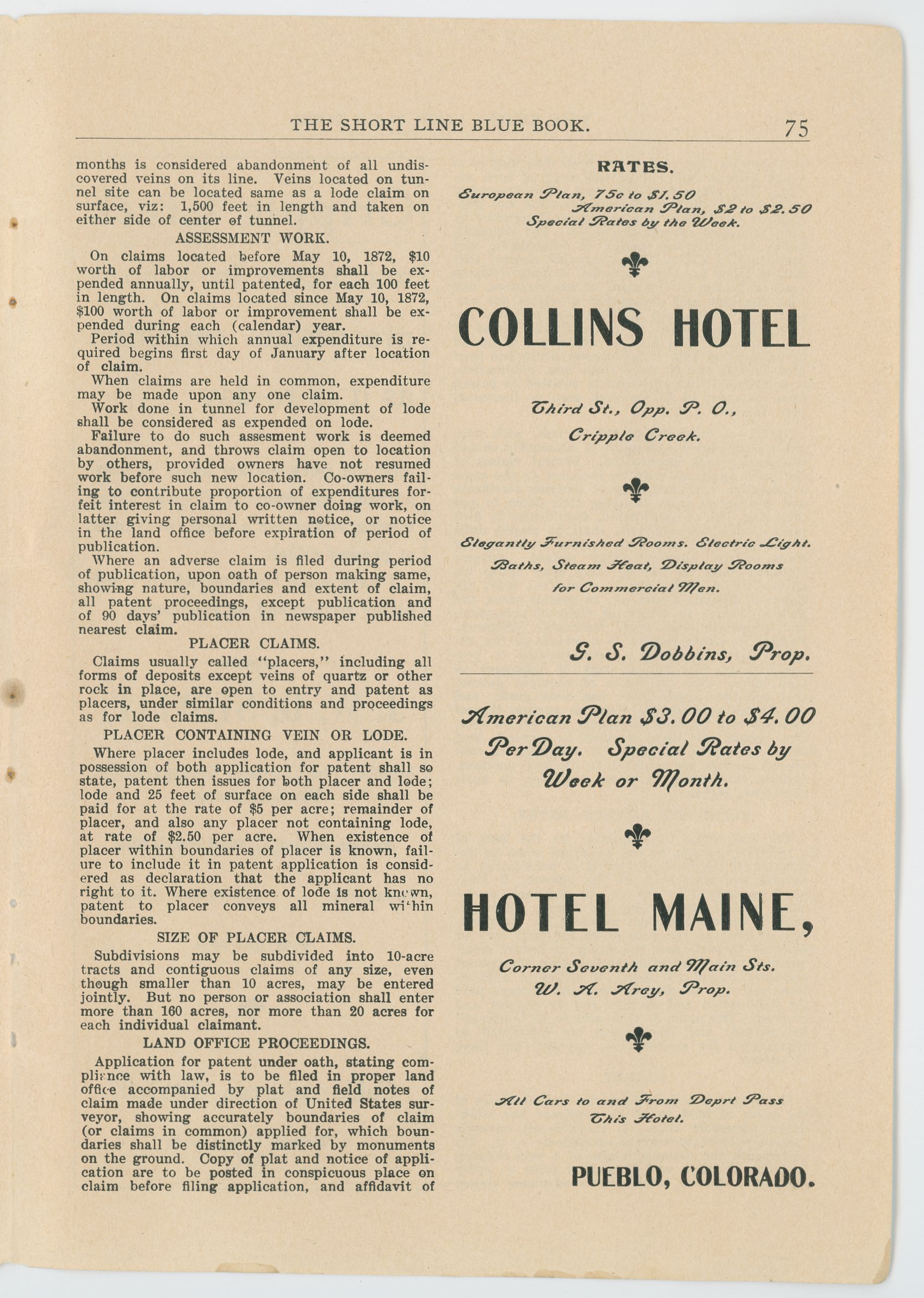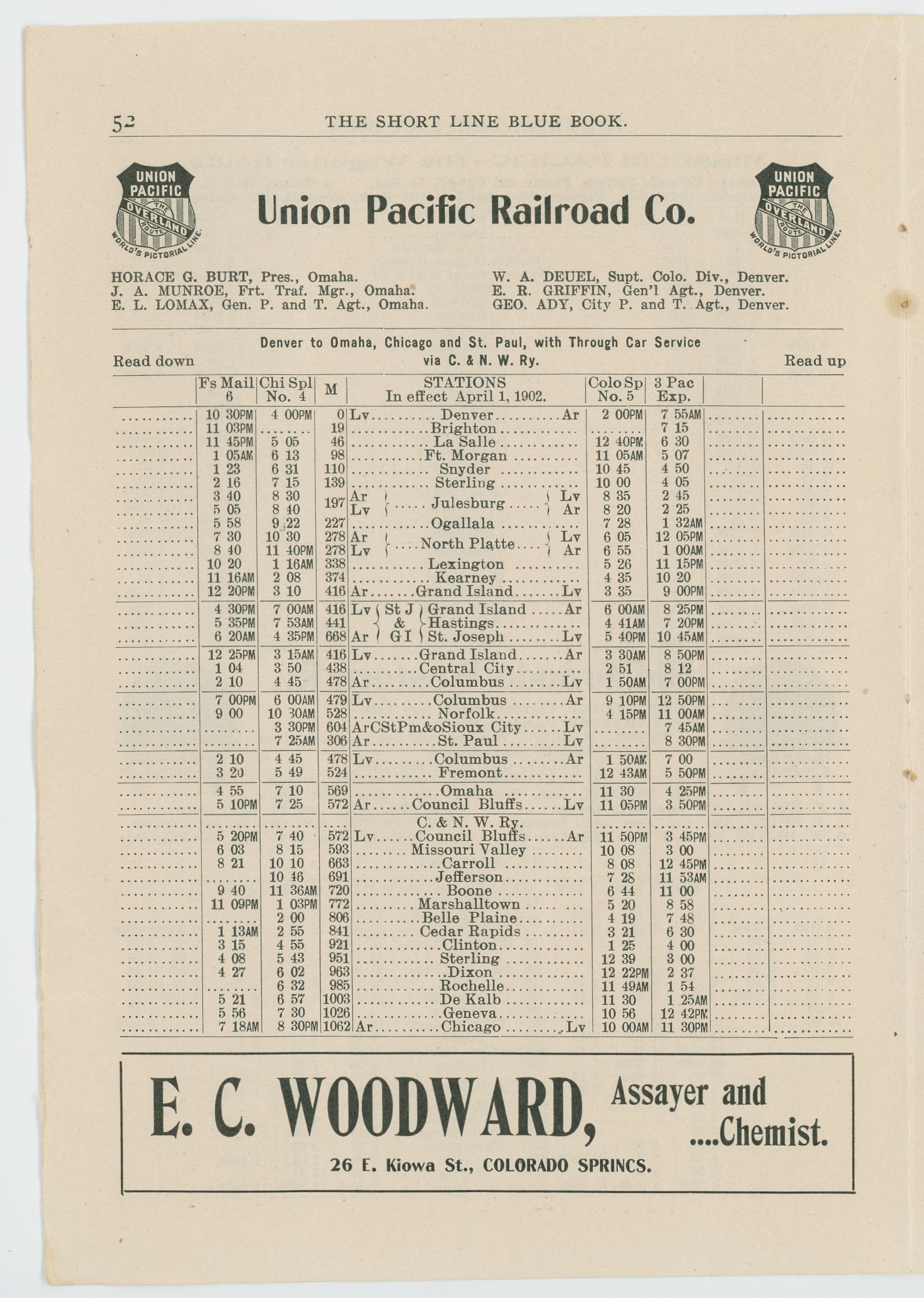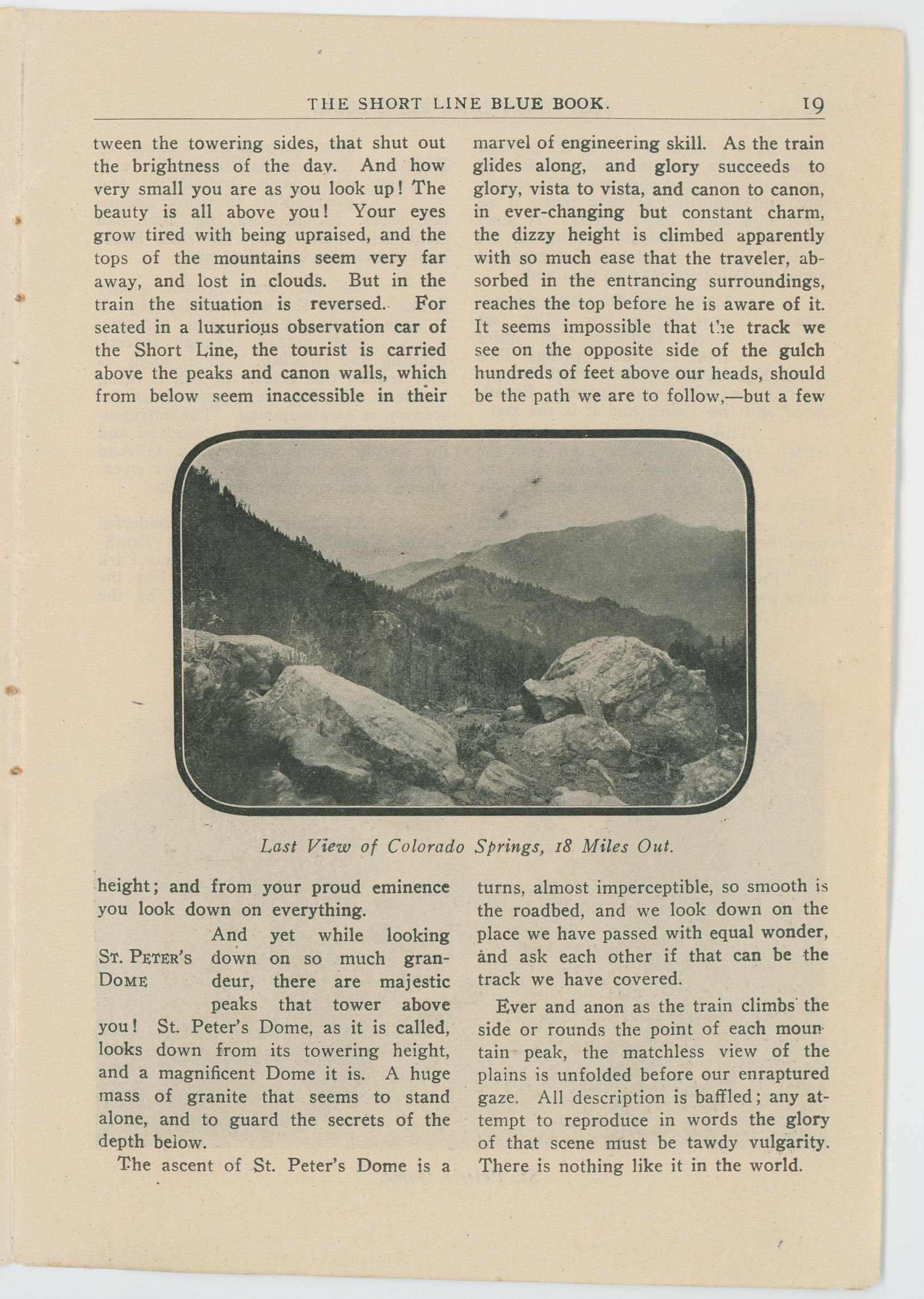 This book is in mostly good shape. There are some paper missing to a couple of pages due to a corner gone missing, some discoloration/staining and bits of small pieces of paper along the edges gone missing. There are paper missing around the stables so for the moment it is loose papers only. This is Volume 2, Number 1, and contains 84 pages, including cover, of ads, timetables, images and text, for not only the Short Line, but most of the larger area extending to all of Colorado for some pieces of info