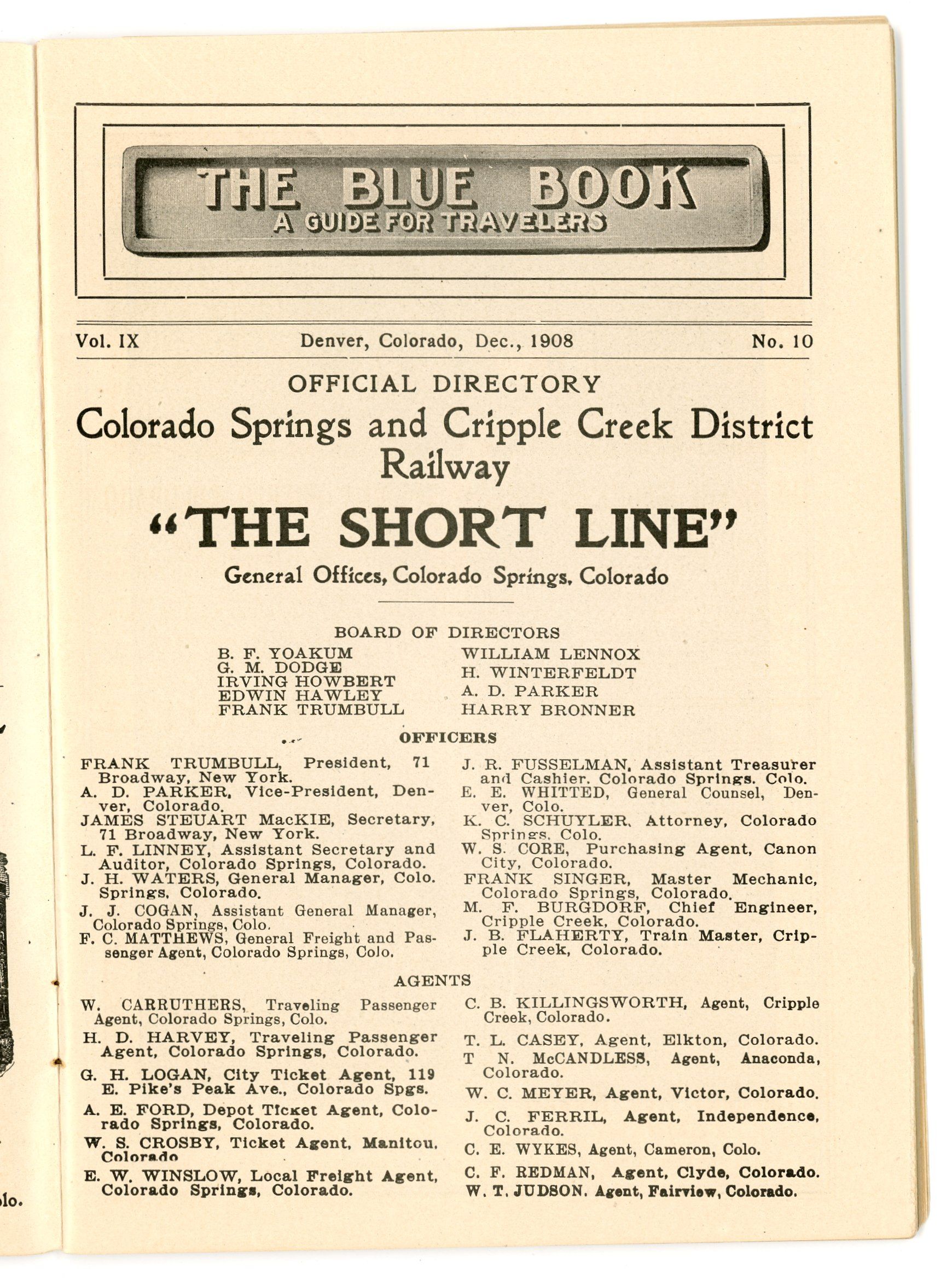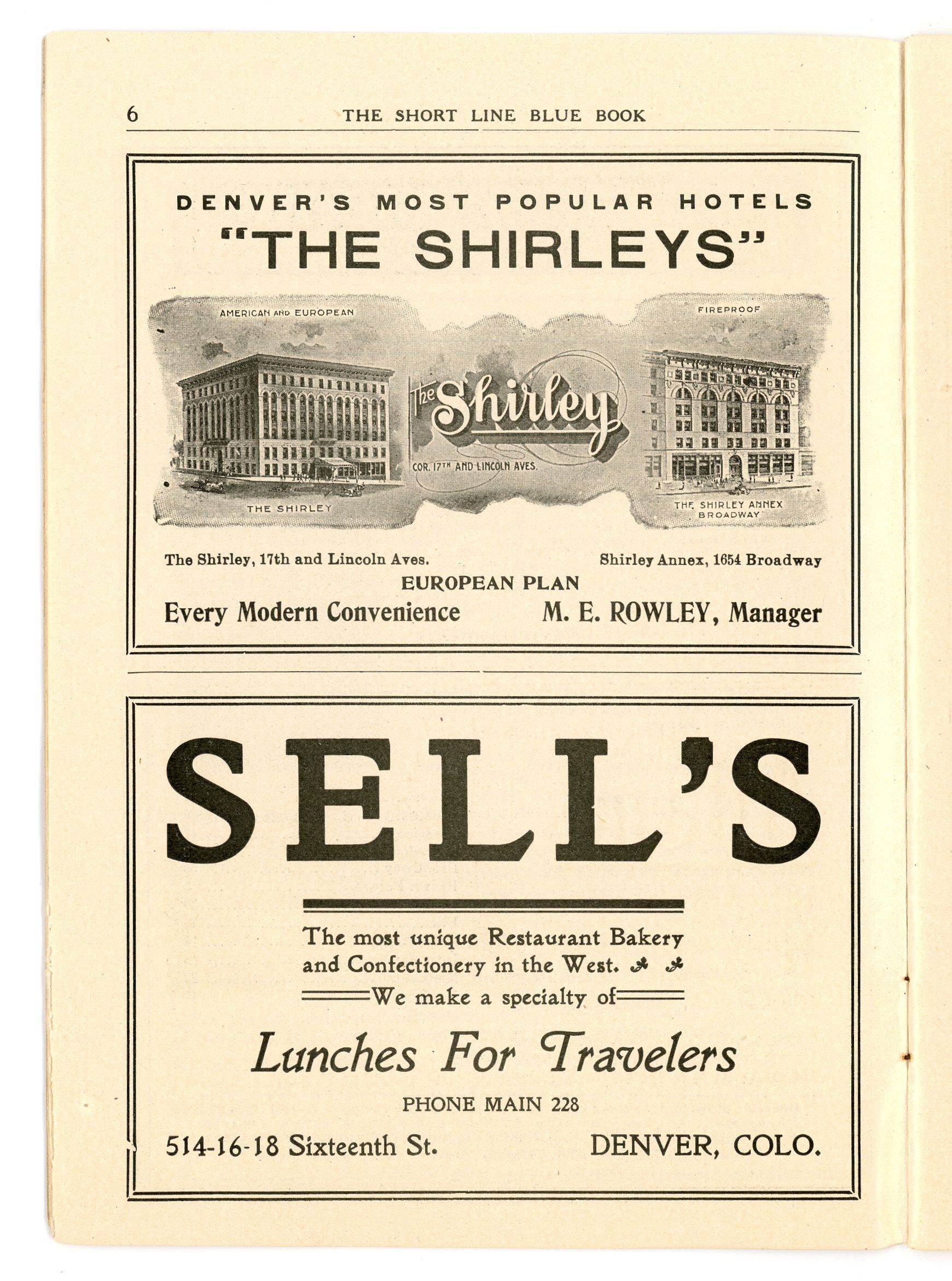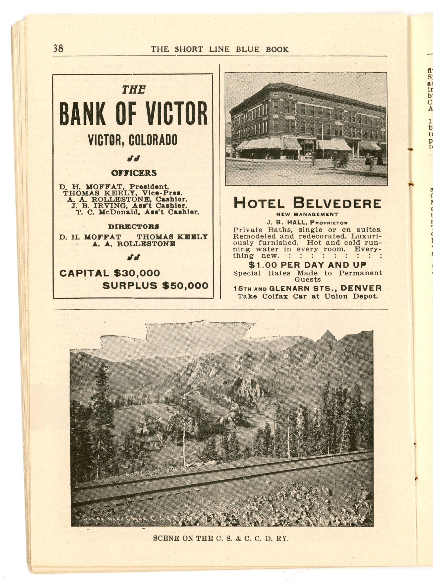 The Book consist of 68 pages including front and back page, but only 64 of them is numbered. This issue is Volume 9, Number 10 and is dated December 1908. It contains pages filled with advertisements, various railroads timetables, images and text for not only the Short Line, but most of the larger area extending to all of Colorado for some pieces of info.