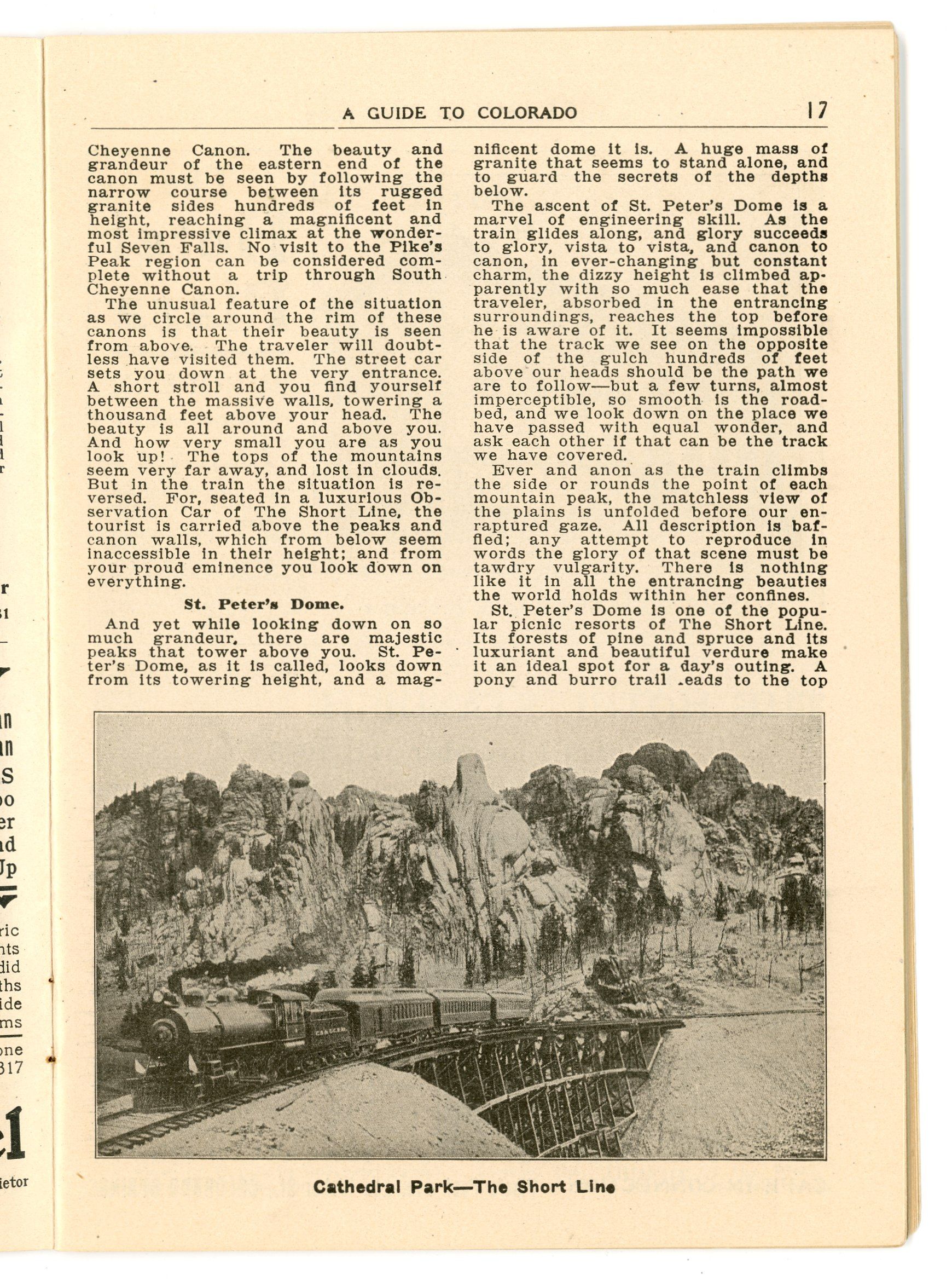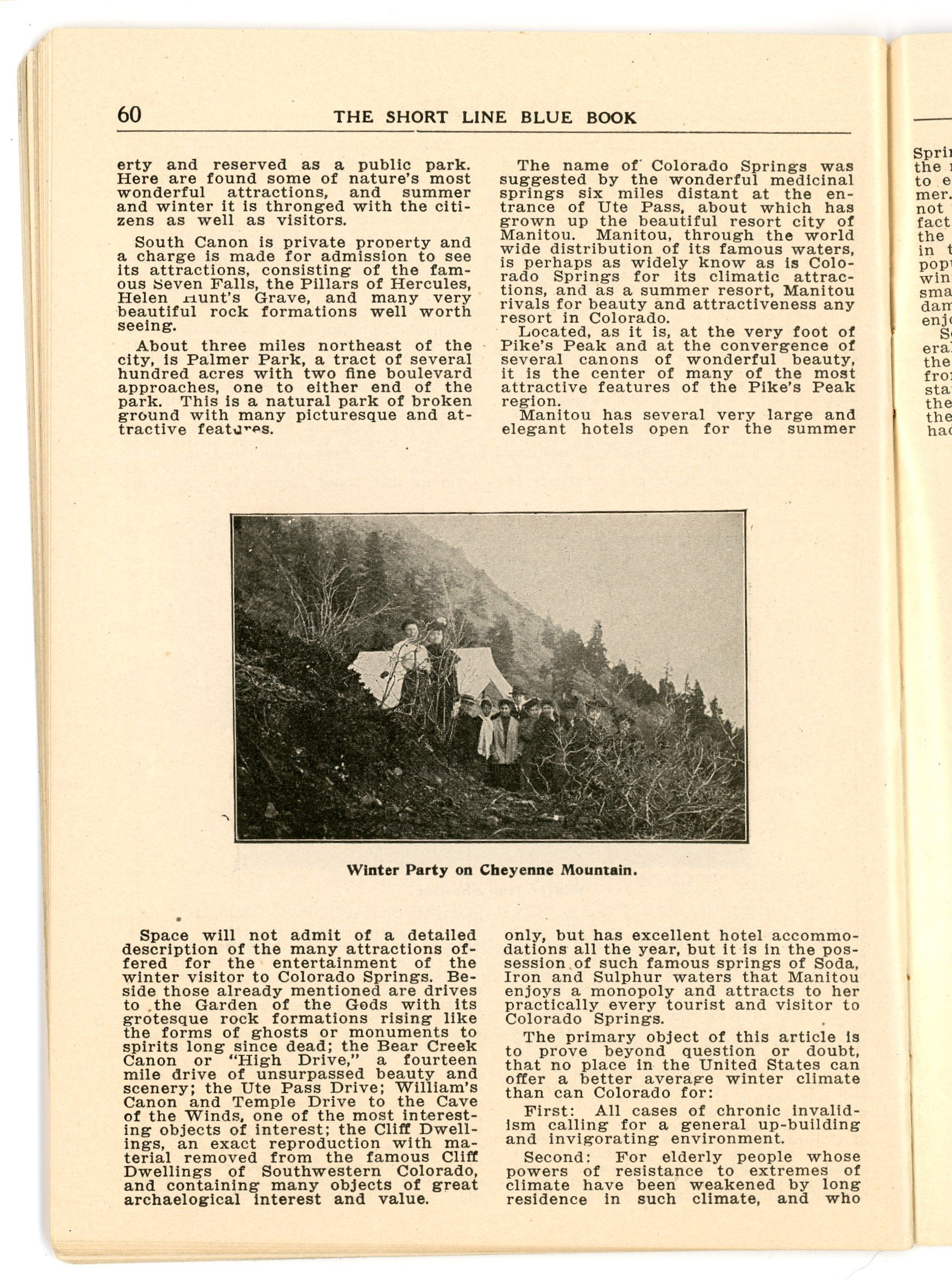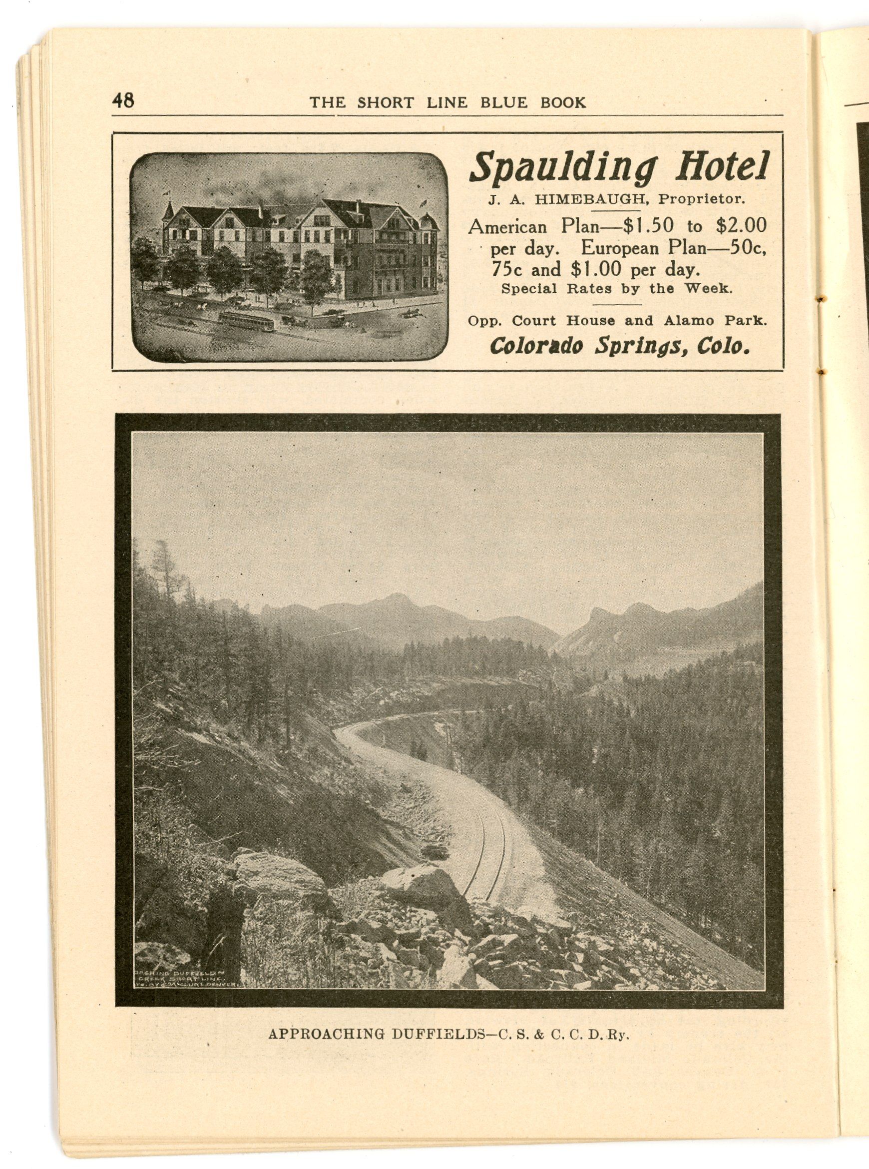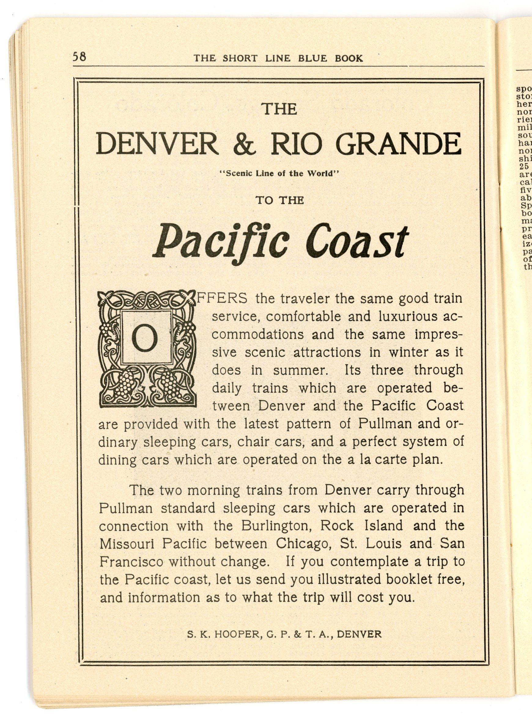 The Book consist of 68 pages including front and back page, but only 64 of them is numbered. This issue is Volume 9, Number 10 and is dated December 1908. It contains pages filled with advertisements, various railroads timetables, images and text for not only the Short Line, but most of the larger area extending to all of Colorado for some pieces of info.