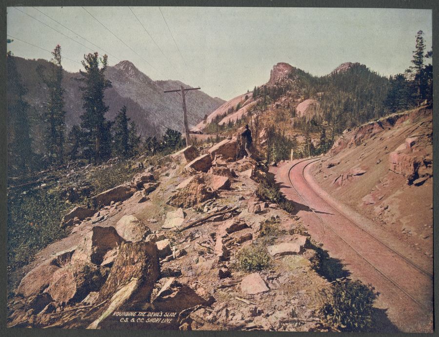 | Photo by William Edward Hook This is a profile view of the "Slide" from the east, with a train winding around the face of the granite mountain on its way from Cripple Creek. The picturesque approach through pine and spruce foliage is in striking contrast to the barren pile of smooth granite. |